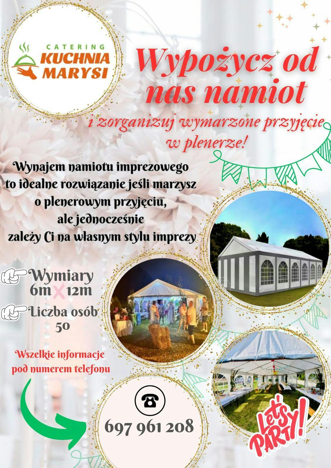 Namiot pozwala stworzyć komfortową przestrzeń do świętowania niezależnie od pogody i sprawdzi się zarówno w ogrodzie, jak i na większych eventach.